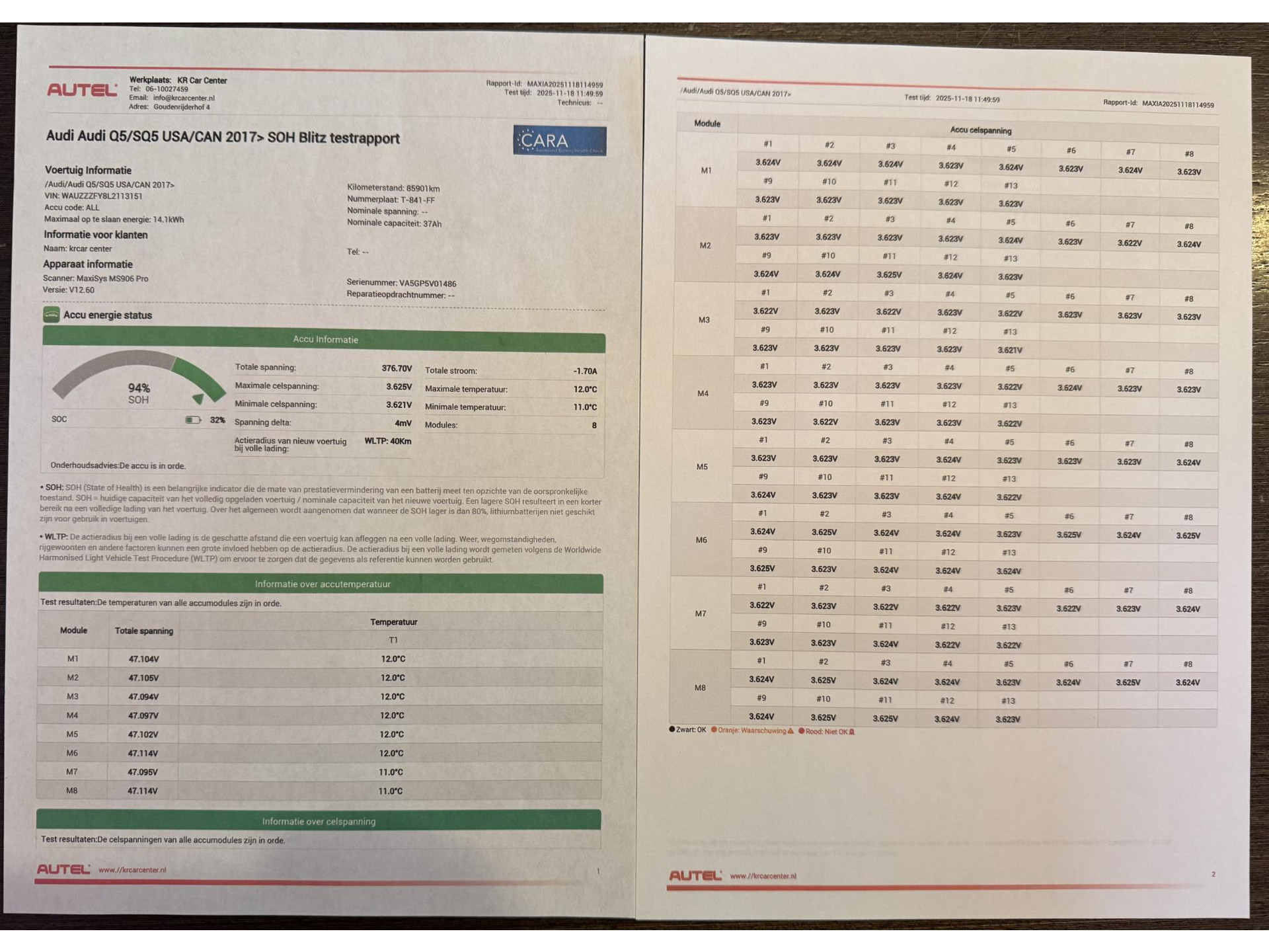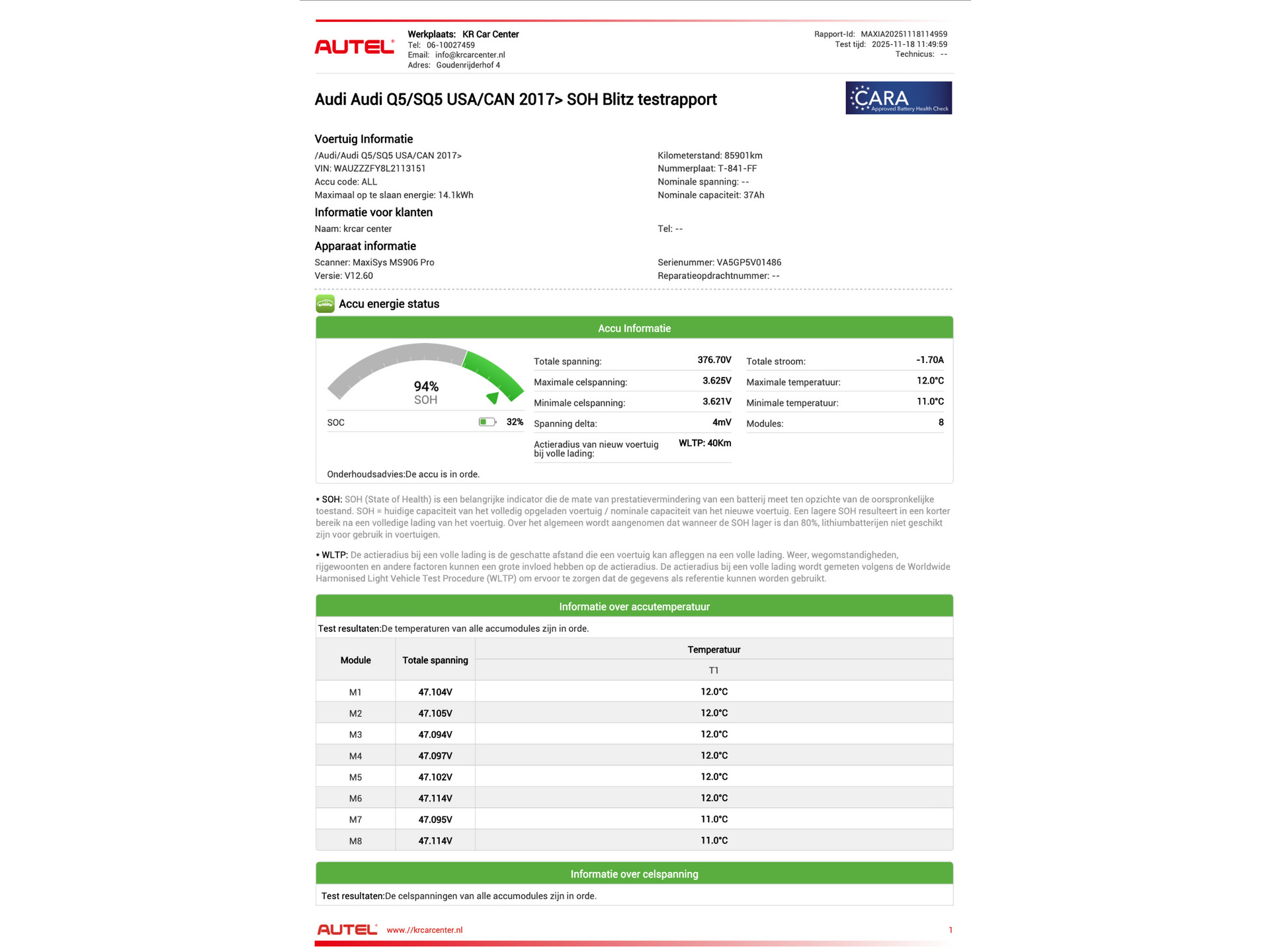 Een recent SOH testrapport uitdraai 18-11-2025 zit bij de auto, accu conditie is 94% en helemaal in orde! (zie laatste foto's)